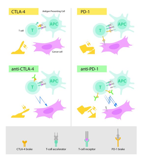 جیمز آلیسون برنده جایزه نوبل پزشکی 2018 در طول دهه 1990 در آزمایشگاه خود در دانشگاه کالیفرنیا برکلی، پروتئین سلول T موسوم به "CTLA-4" را مطالعه کرد. او یکی از چندین دانشمندی بود که مشاهداتی را مبنی بر اینکه CTLA-4 به عنوان ترمز روی سلولهای T عمل میکند، اعلام کرد.
