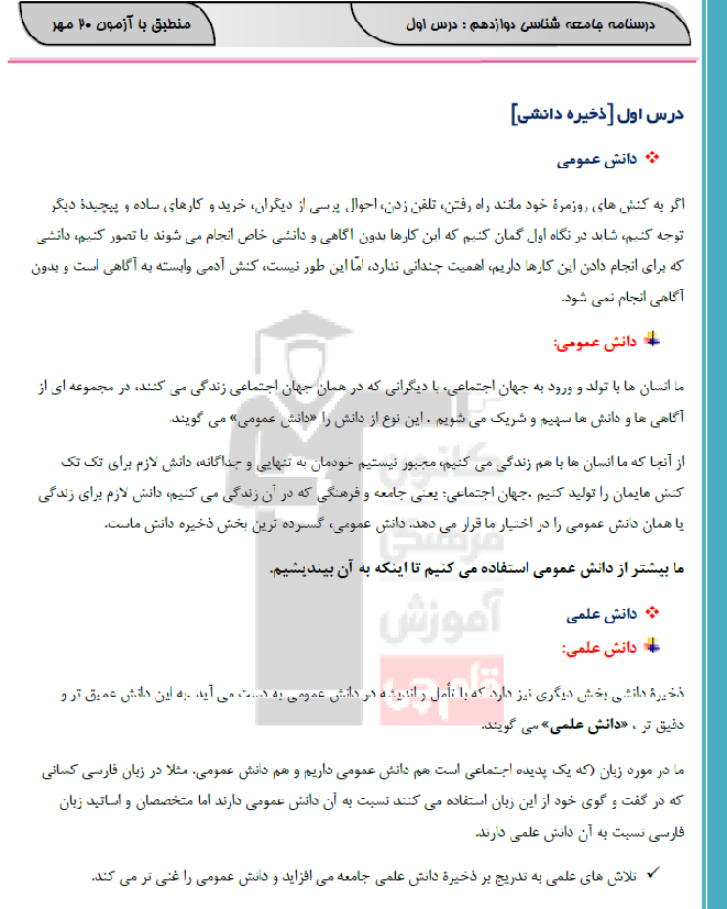 درسنامه جامعه شناسی دوازدهم انسانی درس ذخیره شناختی