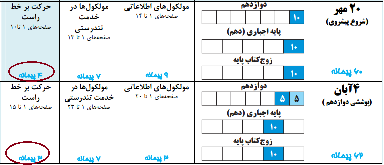 شما تا آزمون 21 دی فرصت دارید منطبق بر برنامه درسی مدرسه یا حتی کمی عقبتر از آن پیمانههای فصلهای اول و دوم را مطالعه کنید این پیمانهها که تقریباً نصف کل کتاب میشوند در 8 آزمون پیشروی( یعنی جدا از آزمونهای جامع) از شما پرسیده خواهد شد و نصف دیگر پیمانهها نیز در 6 آزمون پیشروی بعدی. یعنی اگر با برنامه آزمون پیشبروید میتوانید کل تستهای کتاب را مطالعه کنید.