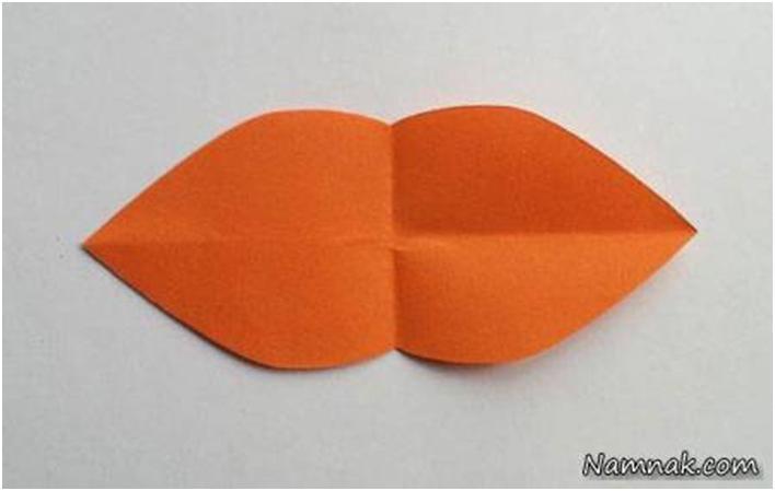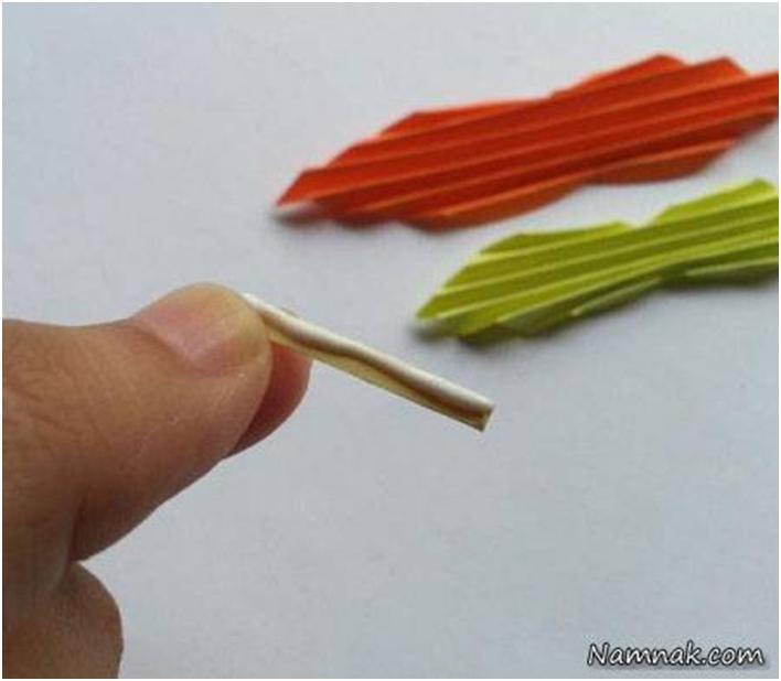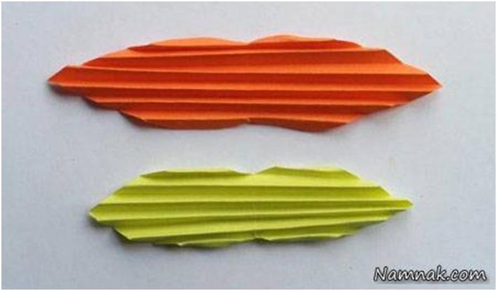 2- مانند شکل ، کاغذ را باید خیلی مرتب و در فواصل یکسانی از هم تا بزنید ، تکه کاغذ رنگی دیگری آورده و همین کار را بر روی آن نیز انجام دهید. این کاغذ باید از اولی کوچکتر باشد.