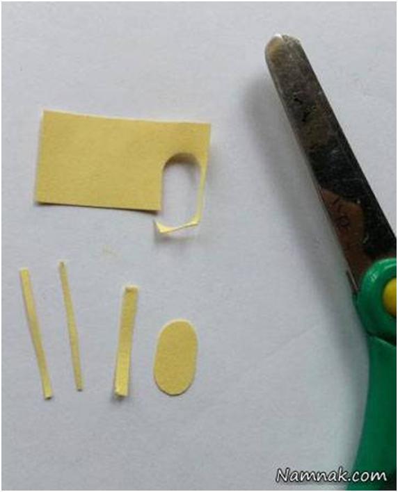 3- 4 تکه کاغذ به صورتی که در تصویر می بینید، دربیاورید. دو تا برای شاخک ها استفاده می شود، یکی برای بدن پروانه است و دیگری هم برای اینکه دو تا بال رو نزدیک هم نگه دارد