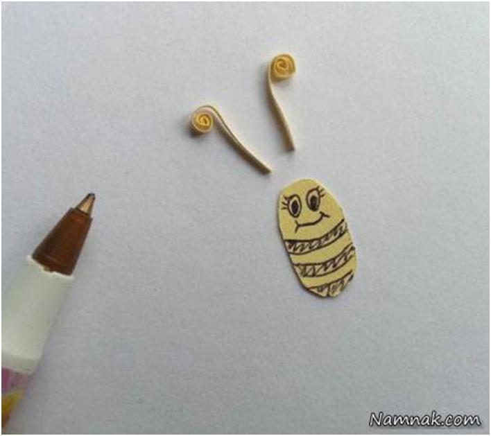 6- دو کاغذ باریک تر را که برای شاخکها انتخاب کرده بودید را کمی تا کنید و یک صورت کارتونی بامزه هم برای صورت پروانه بکشید.