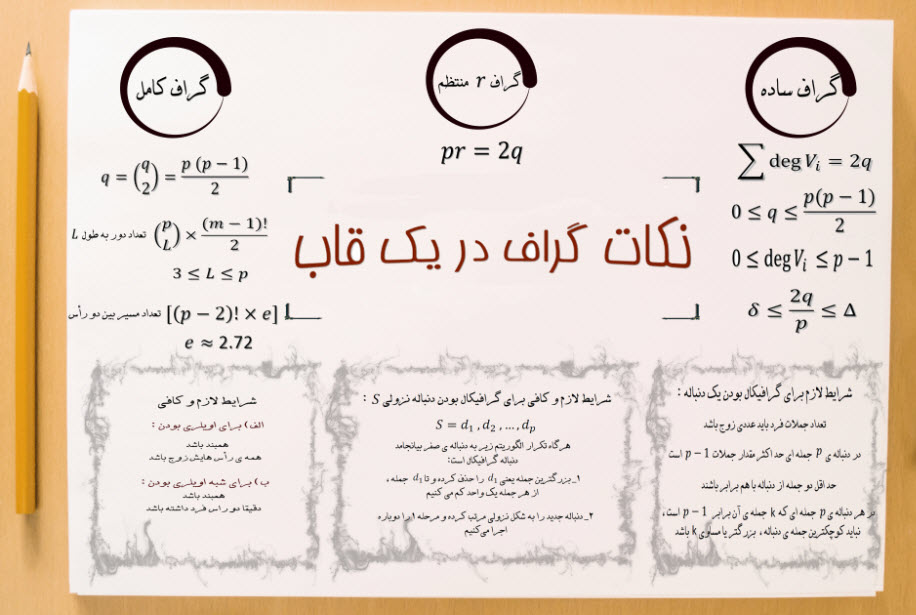 در تصویر زیر می توانید روابط و نکات مهم مبحث گراف از ریاضیات گسسته را که برای شما عزیزان آماده کرده ایم، مشاهده کنید.نسخه ی با کیفیت تصویر را در ضمیمه دانلود کنید.