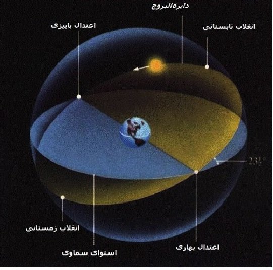مدیر انجمن نجومی آماتوری ایران با تاکید بر اینکه مدار زمین که با در نظر گرفتن حرکت ظاهری خورشید بر کره آسمان از آن به عنوان "دایرةالبروج" یاد میشود، با استوای آسمان که به گفته این فعال حوزه نجومی از امتداد استوای زمین بر روی کره آسمان، دایره "معدلالنهار" یا استوای آسمانی به دست میآید و کره آسمان را به دو نیمکره "شمالی" و "جنوبی" تقسیم میکند، حدود ۲۳.۵ درجه (۲۳ درجه و ۲۷ دقیقه کمان) زاویه میسازد، اضافه کرد: در حقیقت دو صفحه یکی صفحه "استوای آسمان" و دیگری صفحه "مداری زمین به دور خورشید" در دو نقطه با یکدیگر تقاطع دارند و به این نقاط "اعتدالین" گفته میشود که یکی اعتدال بهاری و دیگری اعتدال پاییزی است.