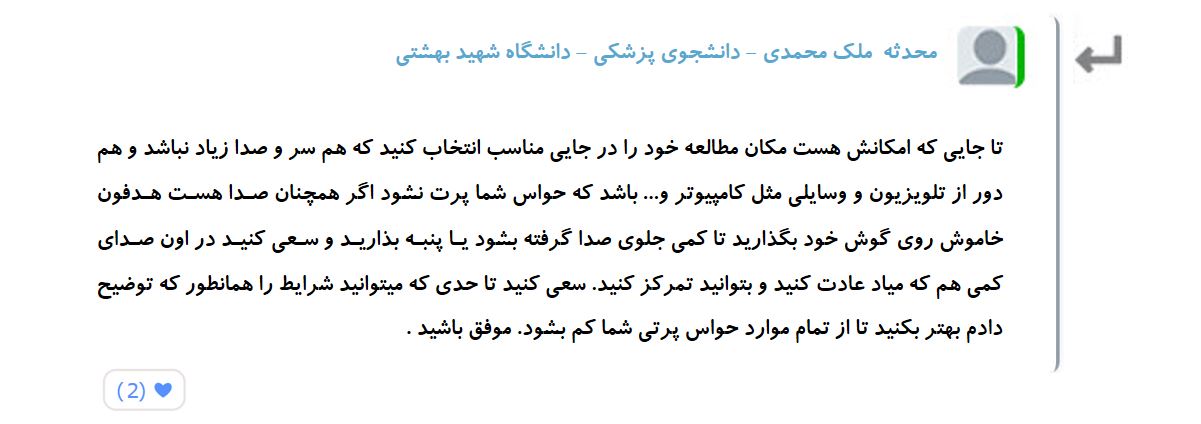 چیزایی که حواستون رو پرت میکنن از اتاق بیرون بذارین ، مثلا من اگه گوشی دستم باشه حتی اگه کار خاصی هم نداشته باشم خیلی خیلی بازدهیم میاد پایین چون هی دوست دارم چک کنم ببینم چه خبره یا همین که جلو چشم باشه و خودمو مجبور کنم دست نزنم تمرکزمو میاره پایین ، پس بهتره کلا اینجور چیزارو نبینیم موقع مطالعه😊 ...