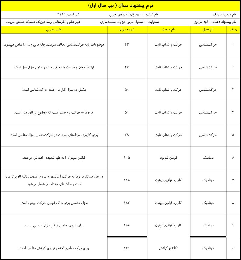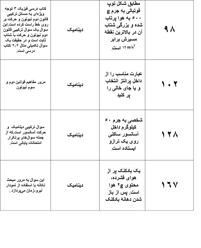 * پرسشهای کاربردی که به طور مثال از قوانین نیوتون به دست می آید پرسیده خواهد شد.