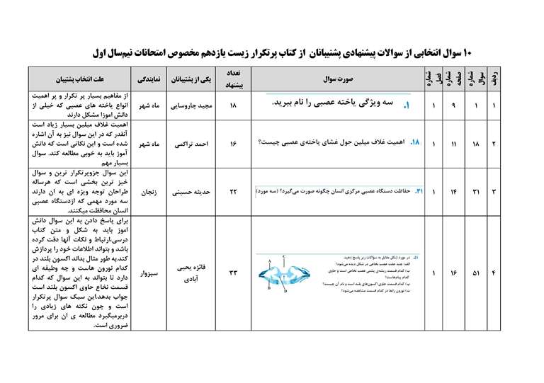 2 | فصل 1 تنظیم عصبی | سوال 76 صفحه 18 کتاب پر تکرار | 1-این سوال ترکیبی بین صفحه های 10، 14 و18 است، پس چند صفحه را با این سوال مرور می کنید. 2-تا کنون 11 بار در امتحانات نهایی به صورت کشوری مطرح شده است(بیشترین تکرار). 3- نکات این سوال هم مربوط به متن صفحه 10، فعالیت 7 فصل 1 صفحه 18، متن صفحه 18 و البته شکل است. 4- فعالیت 7 مربوط به تشریح مغز است و یکی از فعالیت های مهم و پر سوال فصل 1 است. |