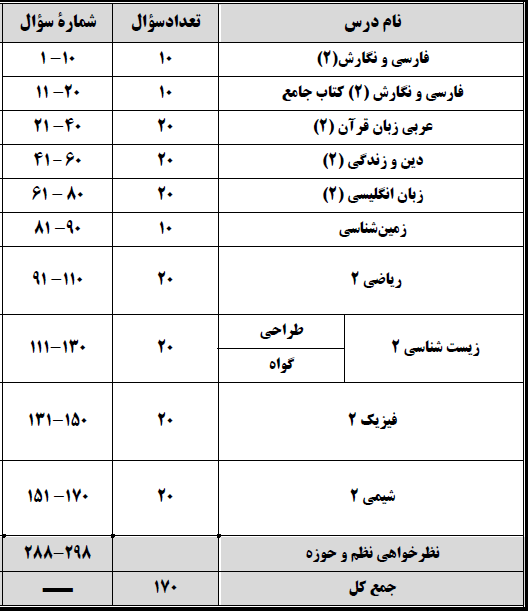 توجه داشته باشید که در این آزمون، در درسهای زیست و فارسی و نگارش آزمون شاهد (گواه) خواهید داشت و زمان در نظر گرفته شده برای این آزمون 165 دقیقه است.