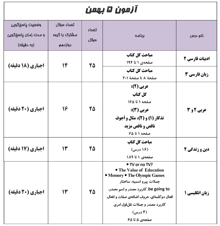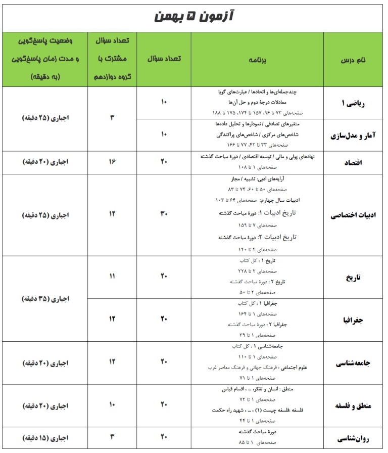 در آزمون 5 بهمن مباحث مشترک دروس پایه سالهای دهم و یازدهم با گروه فارغالتحصیل مورد پرسش قرار میگیرد.