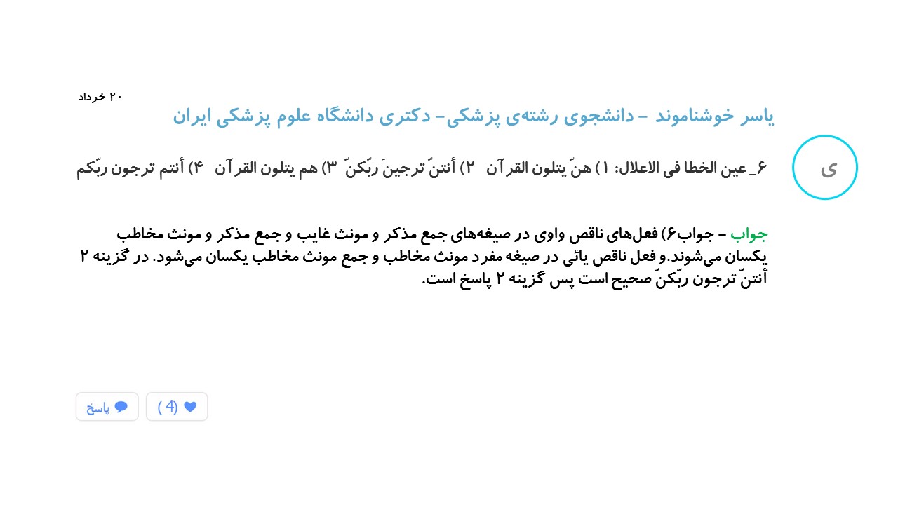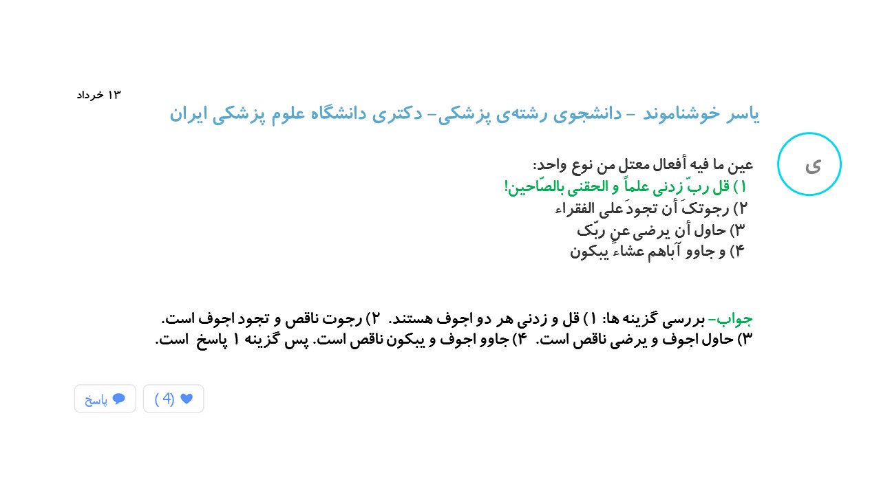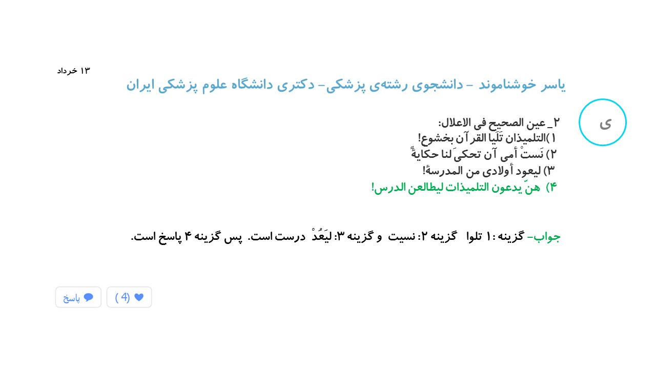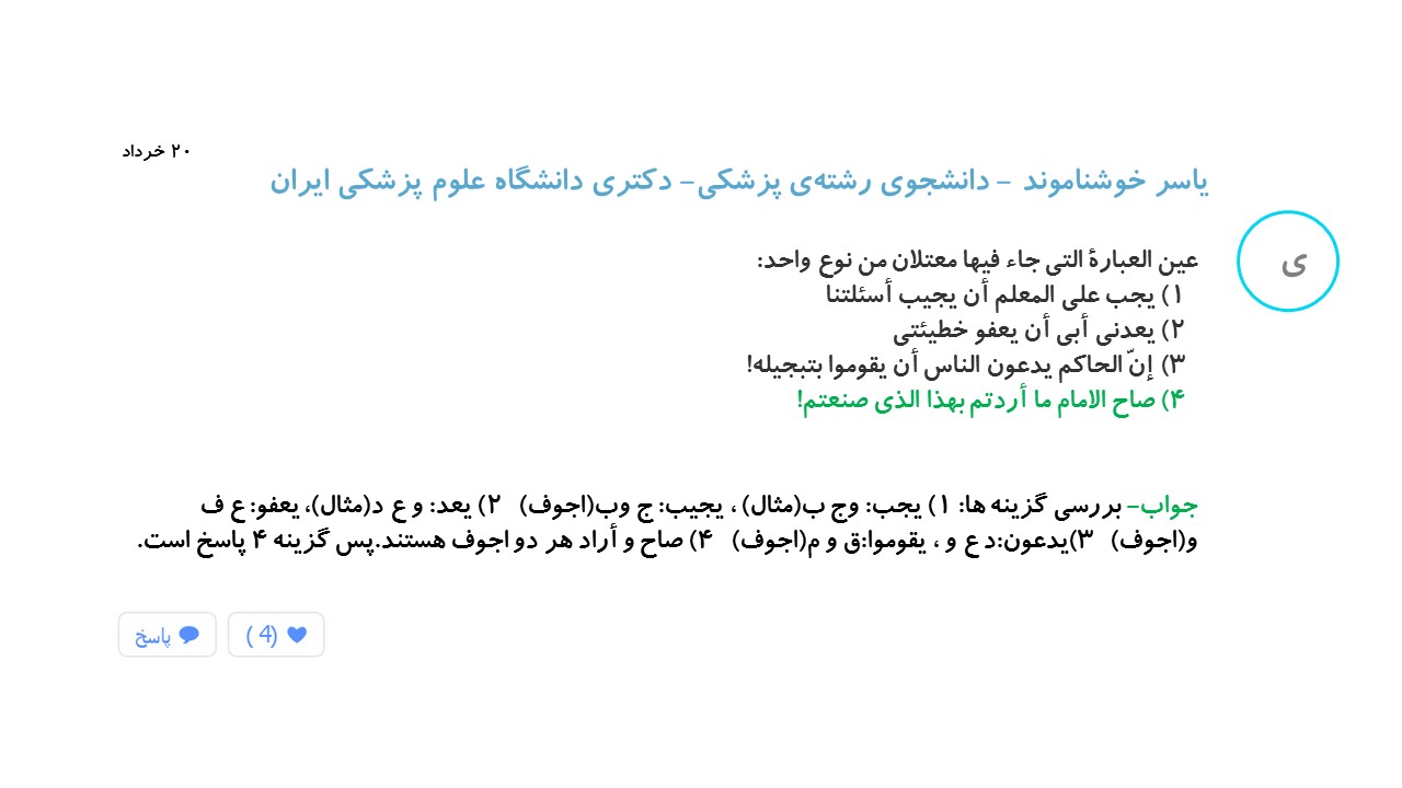 محمد عابدینی - دانشجوی رشته حقوق دانشگاه تهران آماده پاسخگویی به سوالات شما در رابطه با مباحث عربی آزمون 19 بهمن در بخش نظرات می باشد .