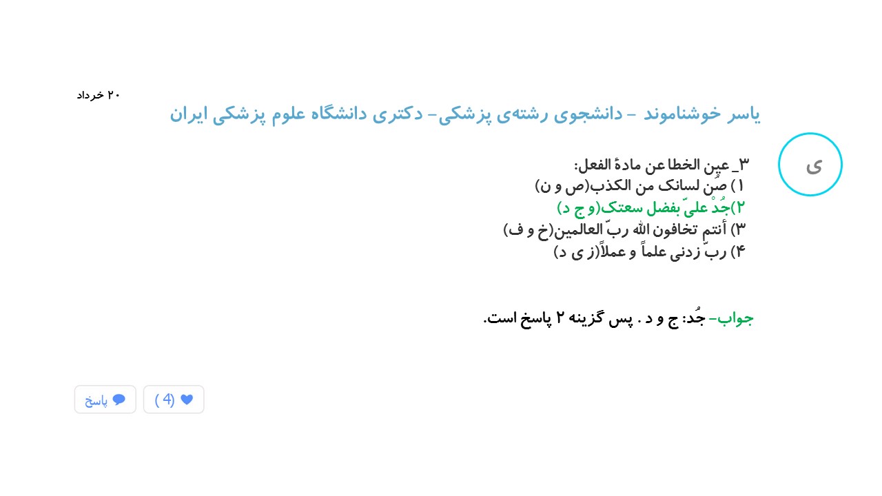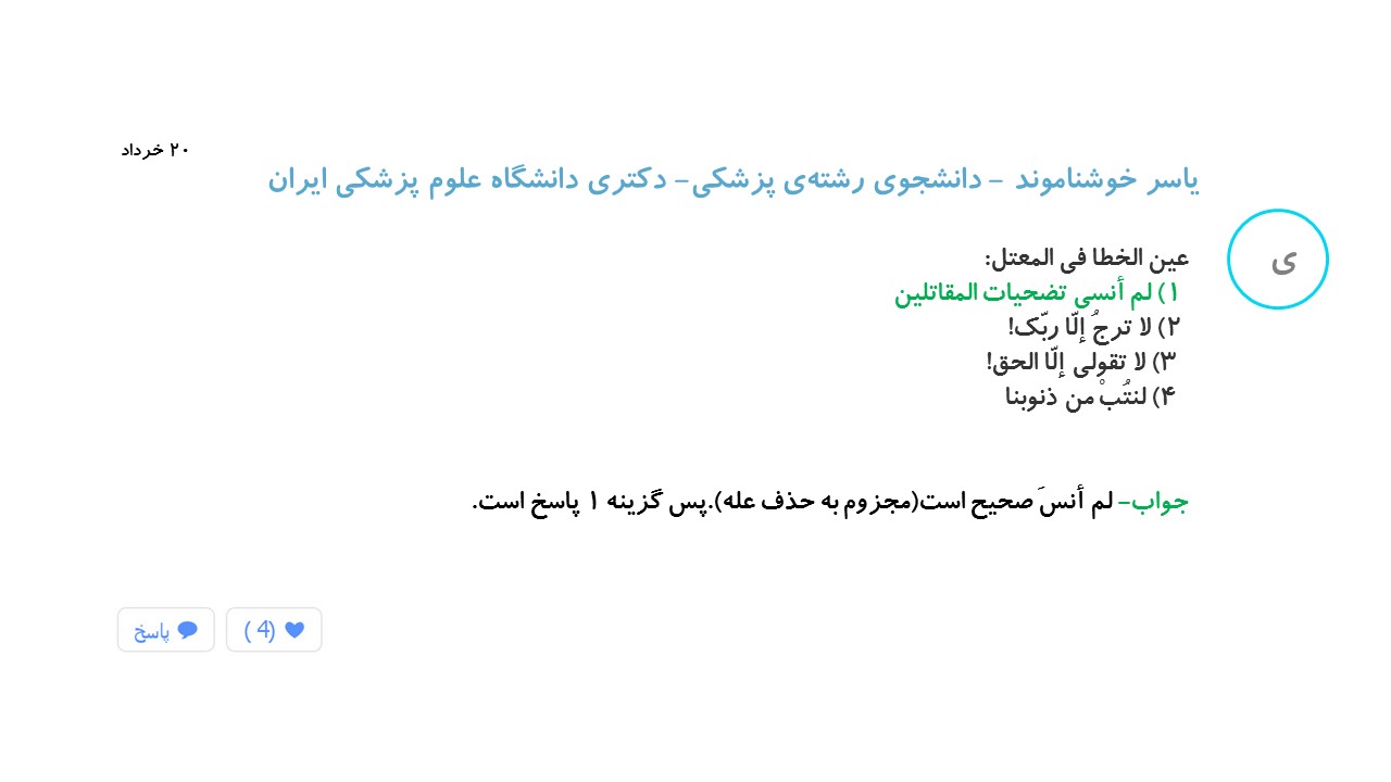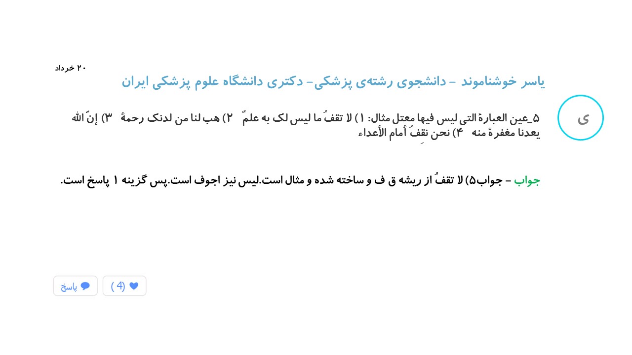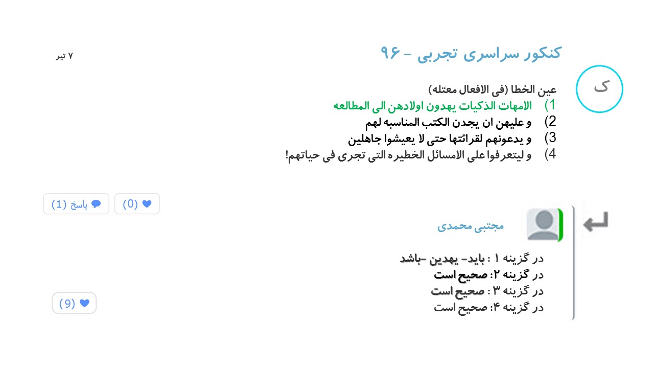 محمد عابدینی - دانشجوی رشته حقوق دانشگاه تهران آماده پاسخگویی به سوالات شما در رابطه با مباحث عربی آزمون 19 بهمن در بخش نظرات می باشد .