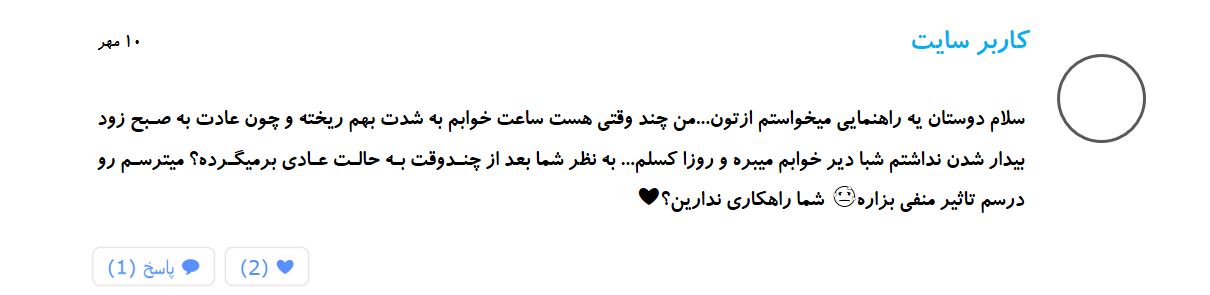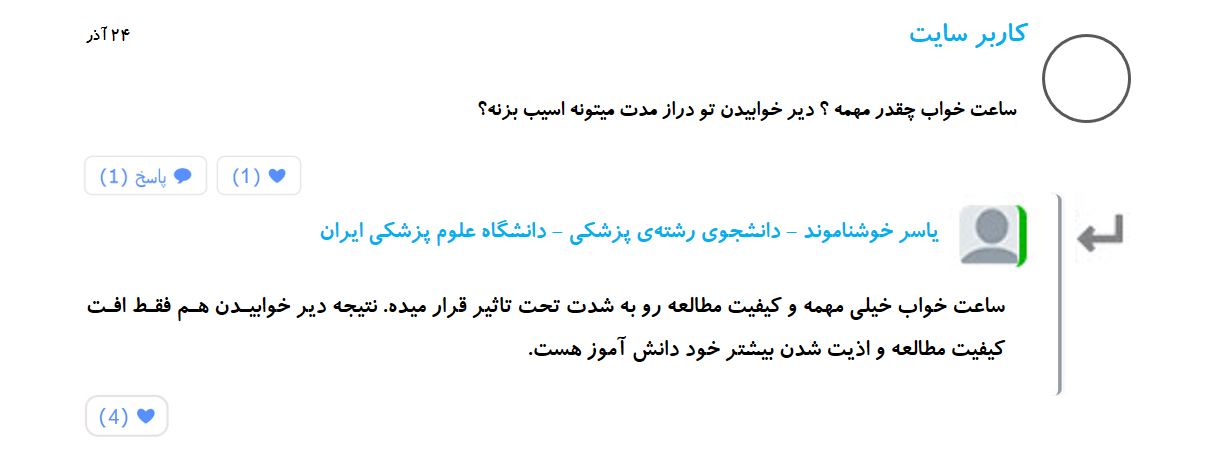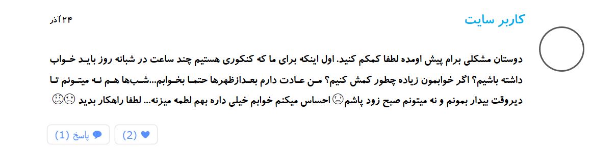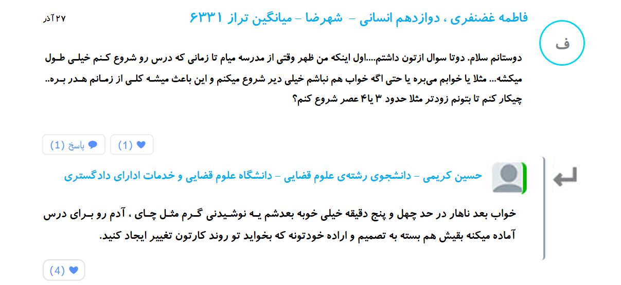 کاربر سایت : یه سوال دارم. من در روزهای تعطیل گاهی 9 ساعت هم درس میخونم ولی الان روزایی که مدرسه میرم بیشتر از 3 ساعت نمیتونم بخونم چون شب بلند شده. از مدرسه که میام ساعت 5 شروع به درس میکنم و ساعت 9 دیگه چشام میره رو هم . بعدازظهر هم تا قبل ساعت 5 حدود یه ساعتی میخوابم ولی نمیدونم چرا اینطوری میشم . خواهشا یه راهکاری بدین. ممنون.