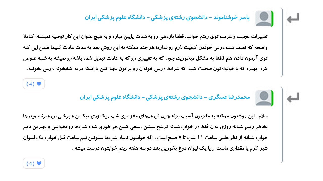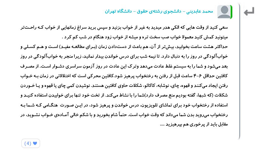 شکیبا قائد، چهارم تجربی - بروجرد : سلام عزیزان راهی بلدید که بشه ساعت خواب رو کاهش داد؟ من در طول شبانه روز خیلی میخوابم و این مانع پیشرفتم میشه اگه راهی دارید لطفا راهنمایی کنید ممنون ❤️