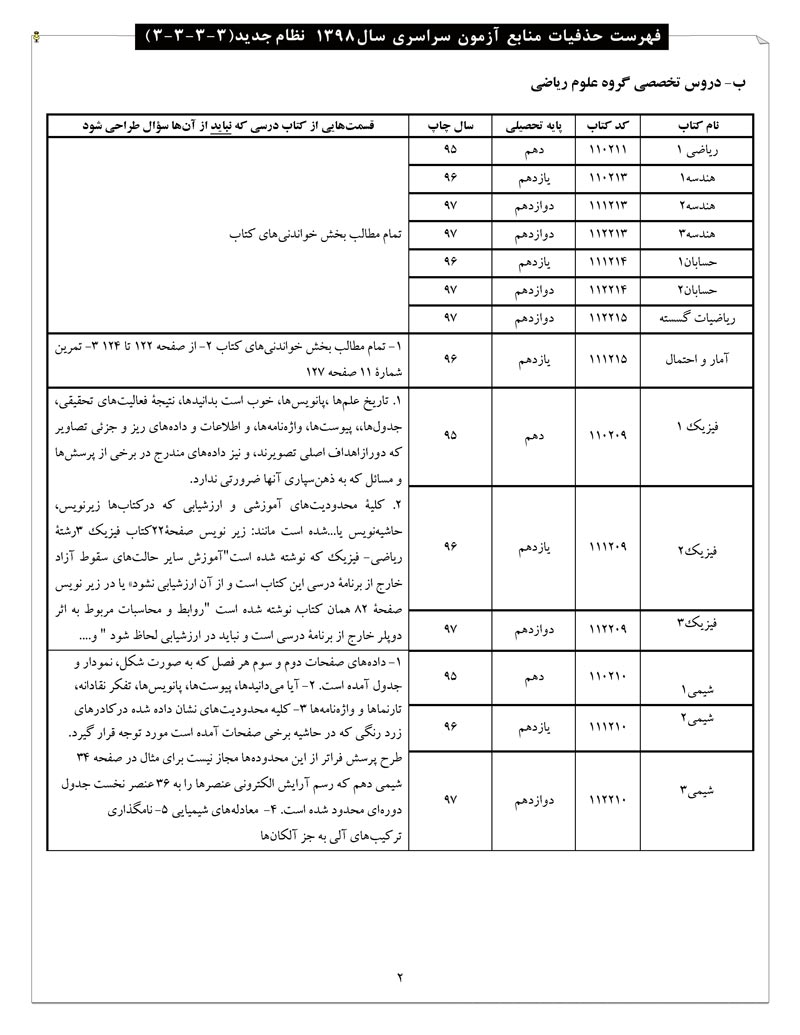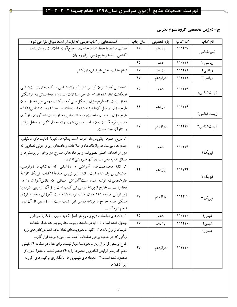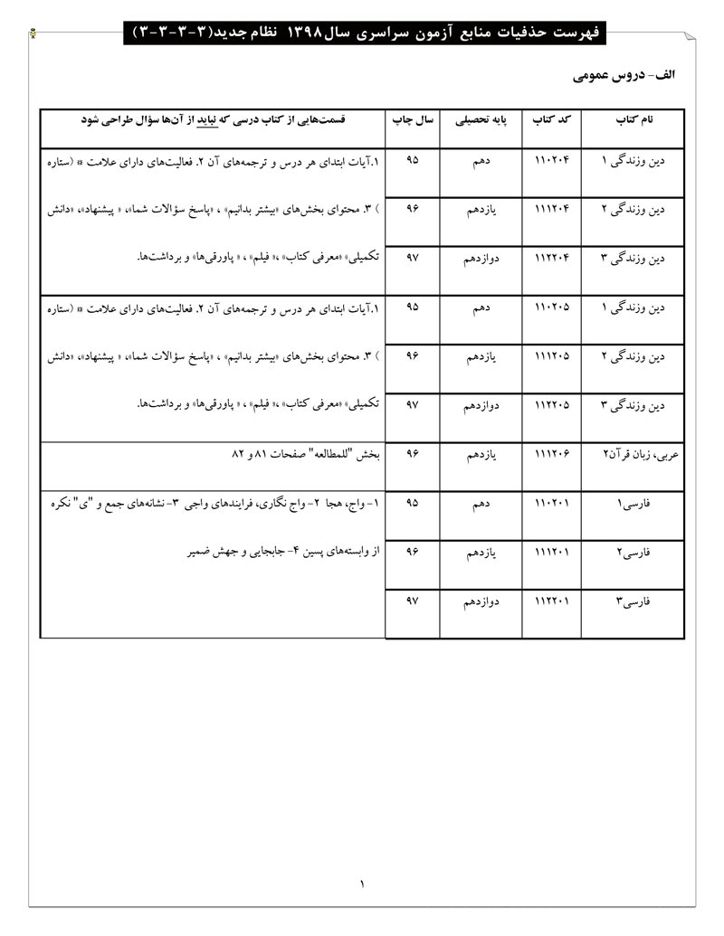 فهرست نهایی حذفیات کنکور 98 - نظام جدید