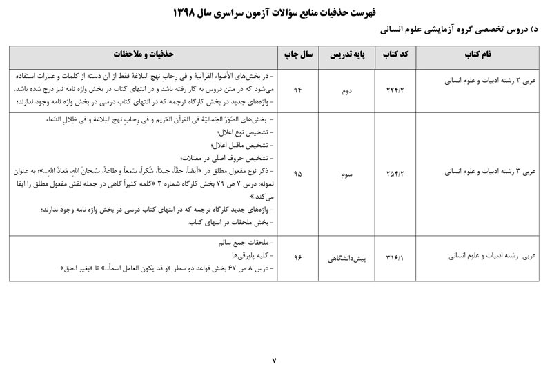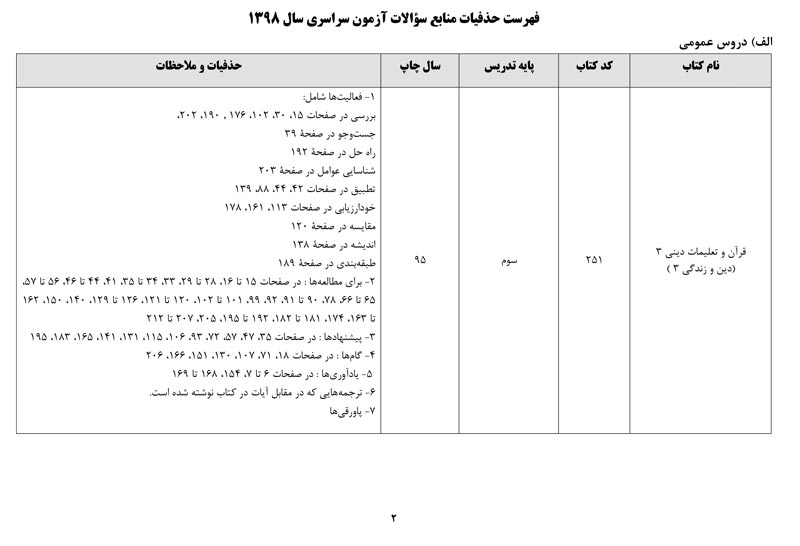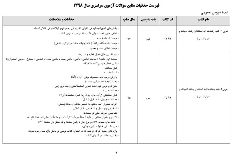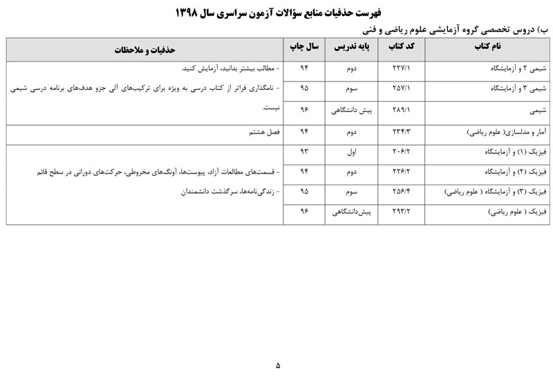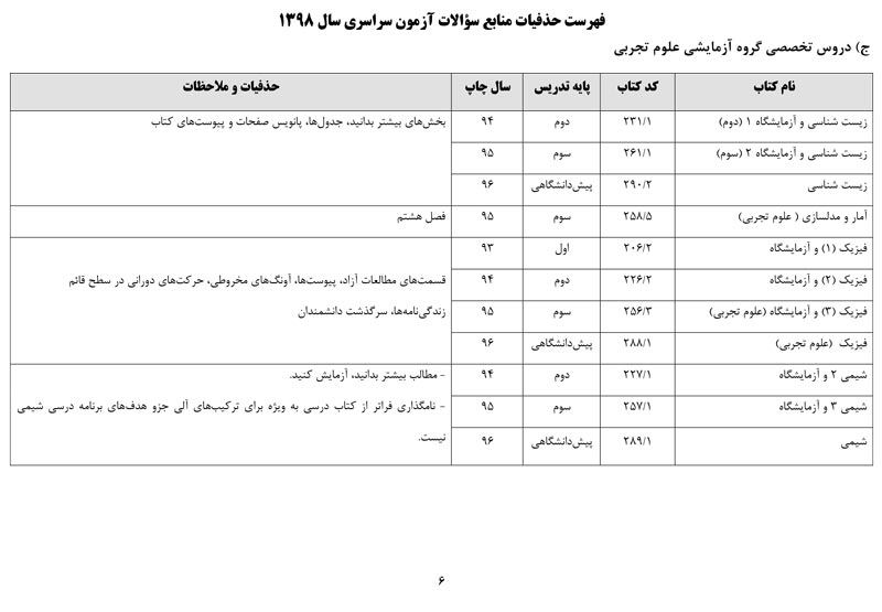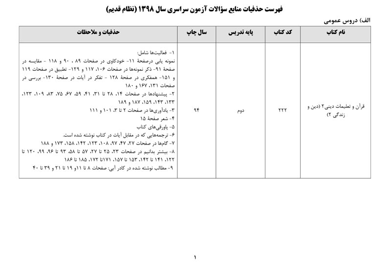 فهرست نهایی حذفیات کنکور 98 - نظام قدیم