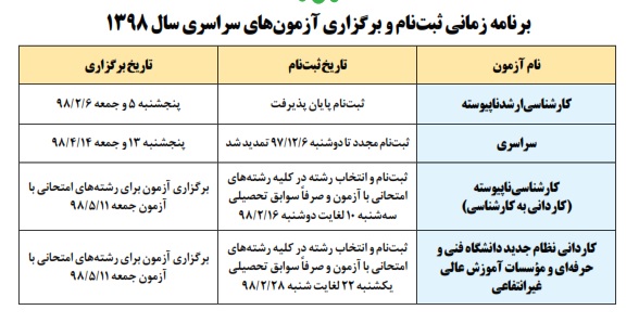 * ثبت نام و انتخاب رشته در کلیه رشته های امتحانی با آزمون و صرفاً سوابق تحصیلی : 22 اردیبشهت تا 28 اردیبهشت 1398