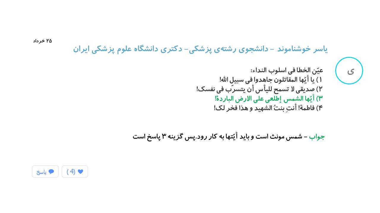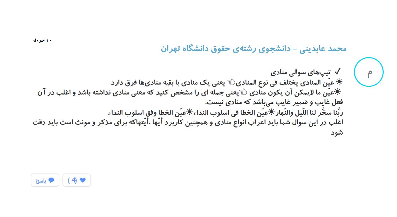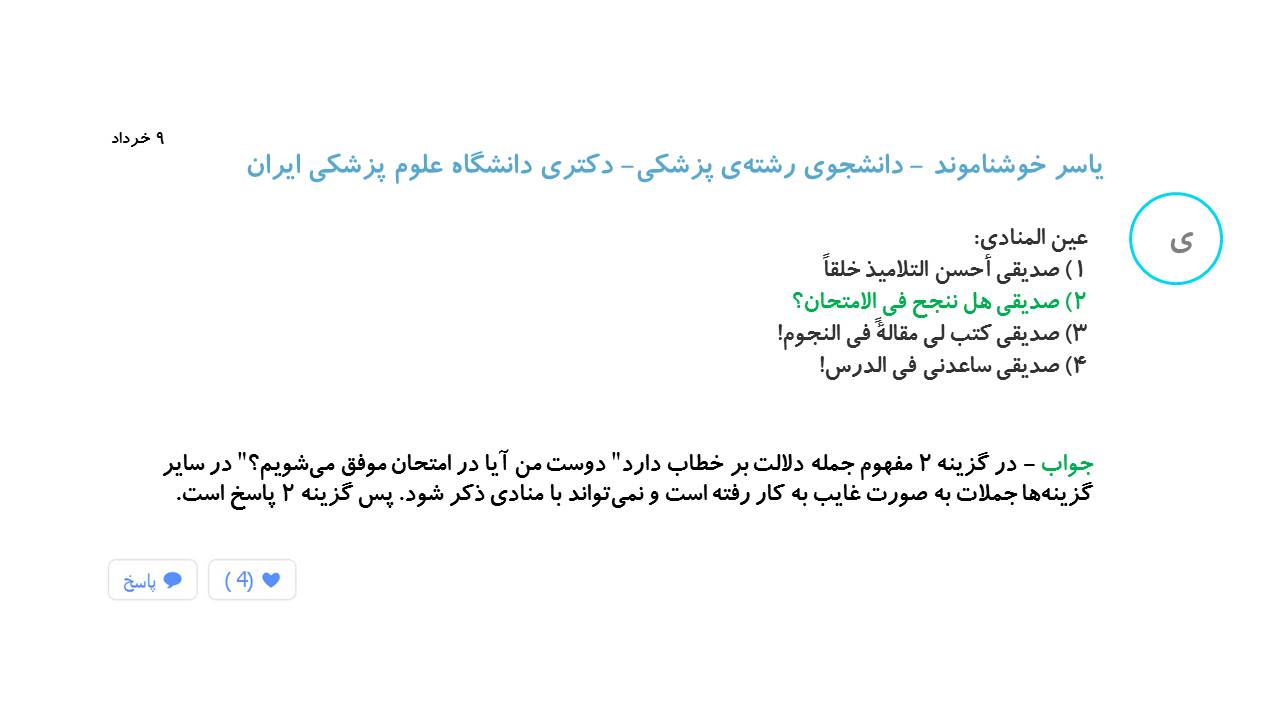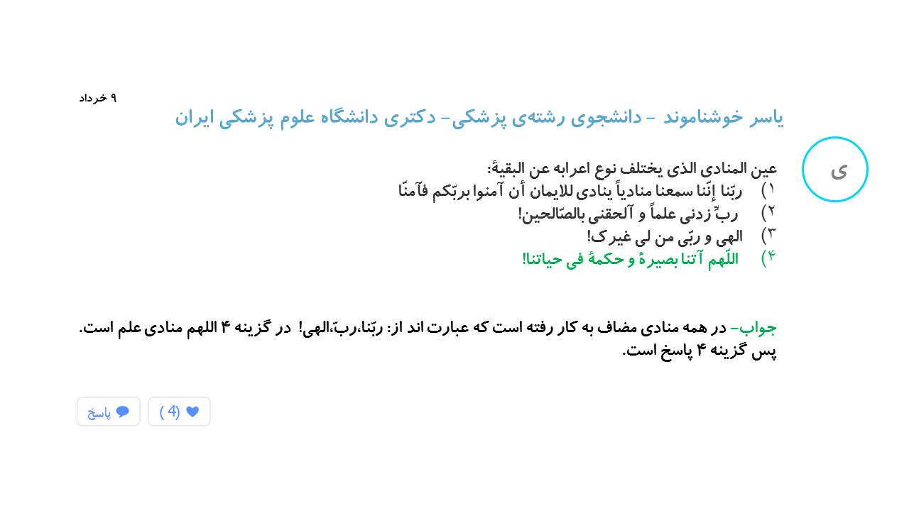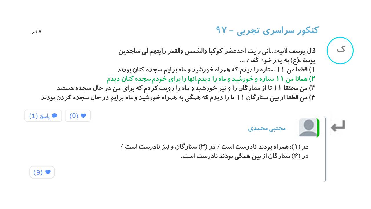 در ادامه بررسی کامنتهای علمی شما در سایت کانون ، چند پرسش مربوط به عربی پیش که توسط رتبههای برتر پاسخ داده شده اند + یک سوال کنکور را برایتان آماده کرده ایم .