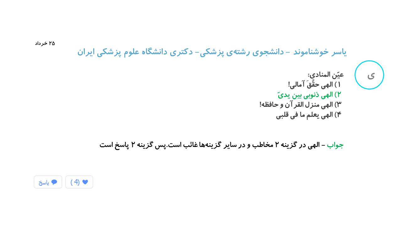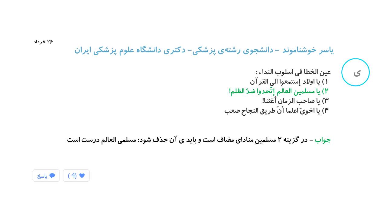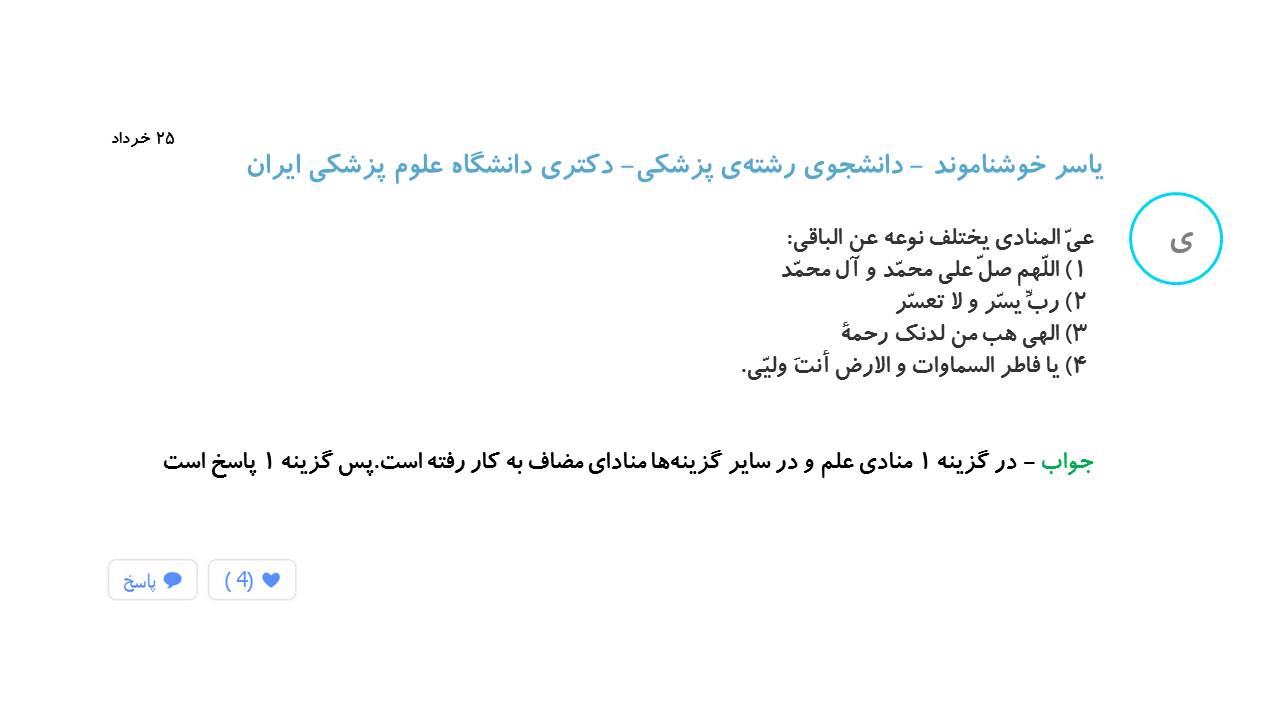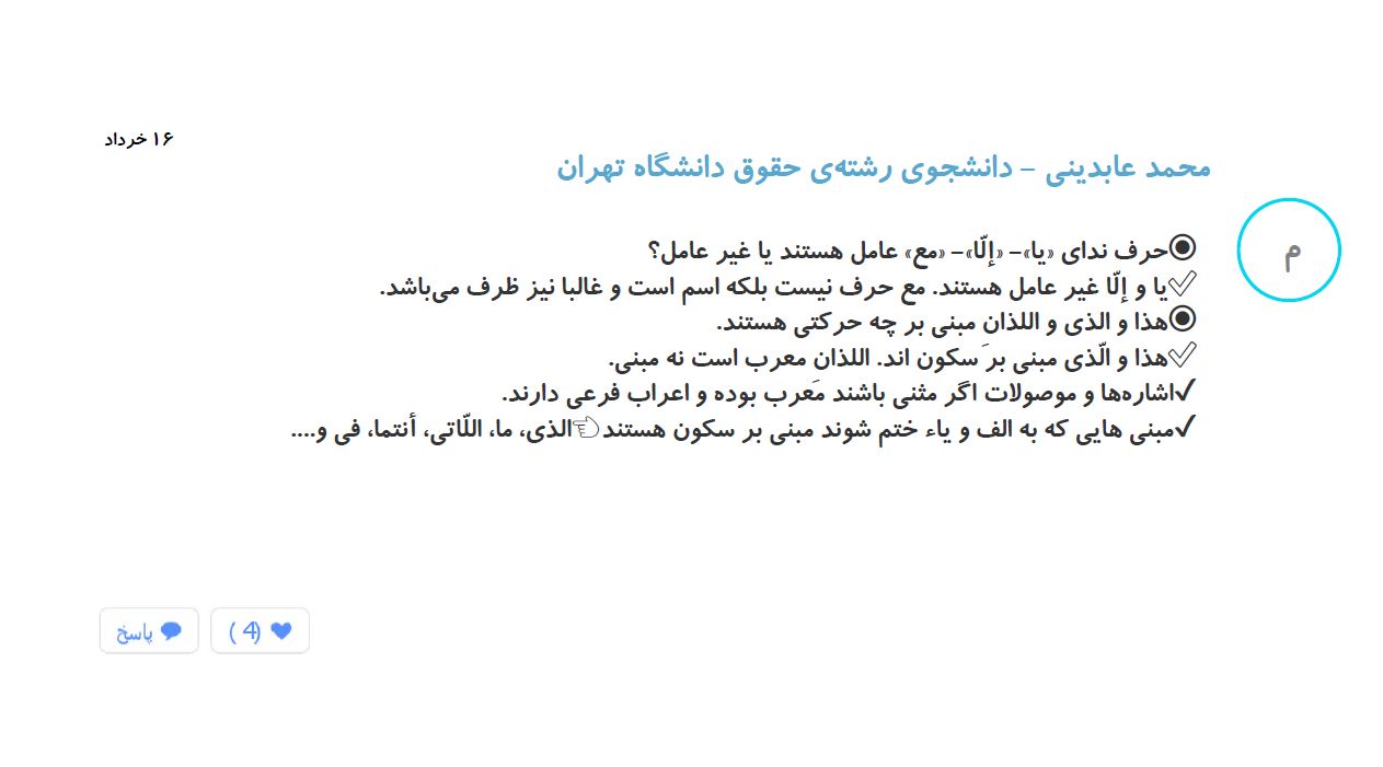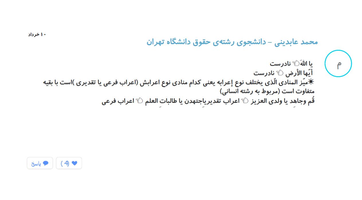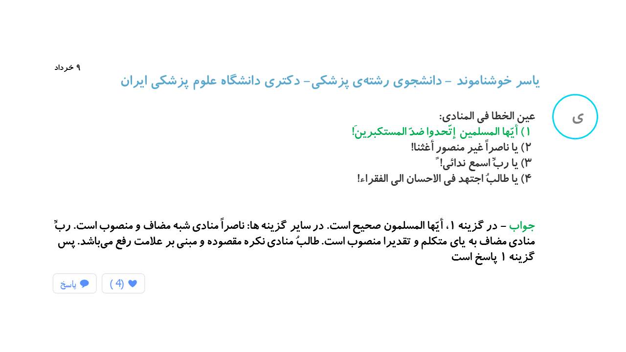 در ادامه بررسی کامنتهای علمی شما در سایت کانون ، چند پرسش مربوط به عربی پیش که توسط رتبههای برتر پاسخ داده شده اند + یک سوال کنکور را برایتان آماده کرده ایم .