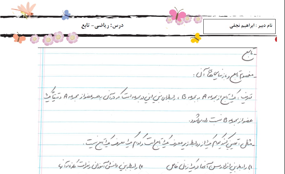 با سلام در این فایل درسنامه ریاضی دهم مبحث تابع قرار دارد که توسط ابراهیم نجفی برای آمادگی بیشتر شما در آزمون 16 فروردینماه 98 تهیه شده است.برای مشاهده ادامه درسنامه به فایل ضمیمه مراجعه نمایید.موفق باشید.