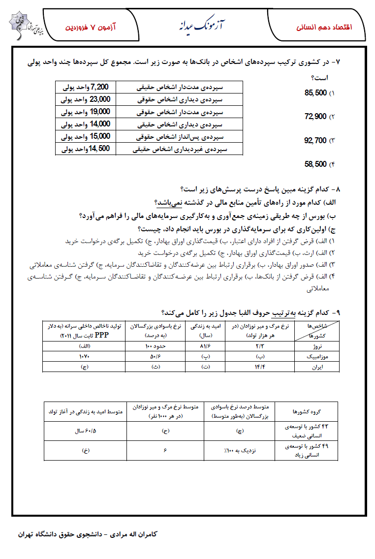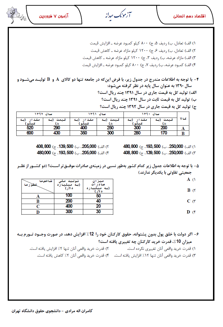 آزمونک و مجموعه سوال اقتصاد دهم انسانی نمونه سوال اقتصاد کنکور انسانی طراح: کامران اله مرادی