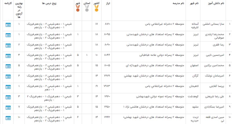 با امکان جدیدی که در قسمت رتبه های برتر آزمون ها ایجاد شده است ، می توانید مشاهده کنید که هرکدام از برترها به کدام زوج درس ها پاسخ داده اند ؟