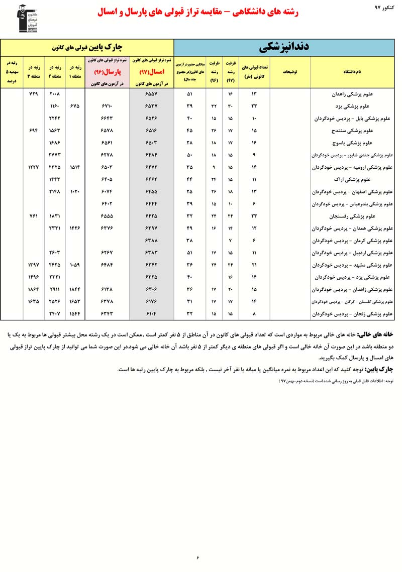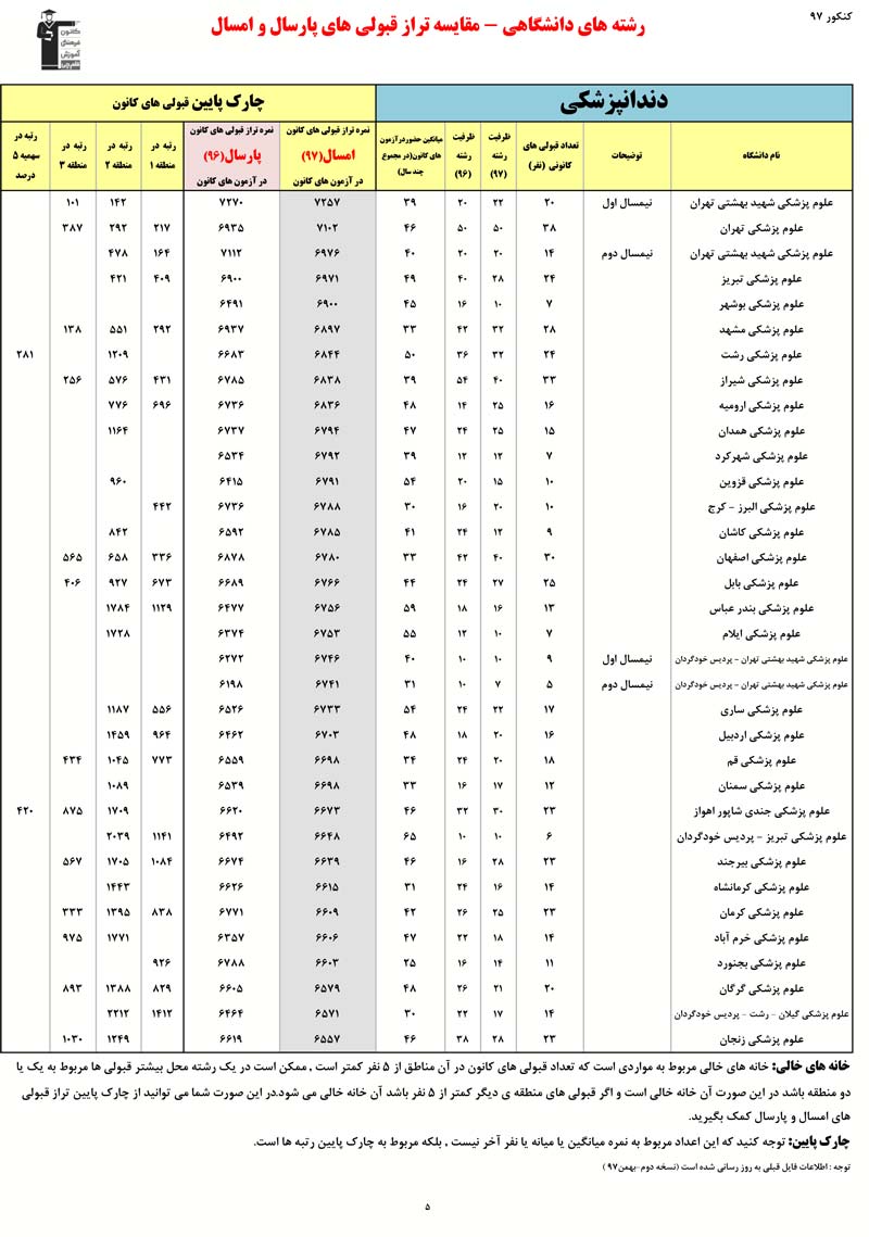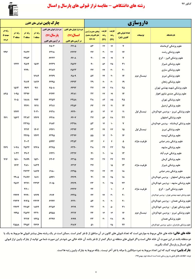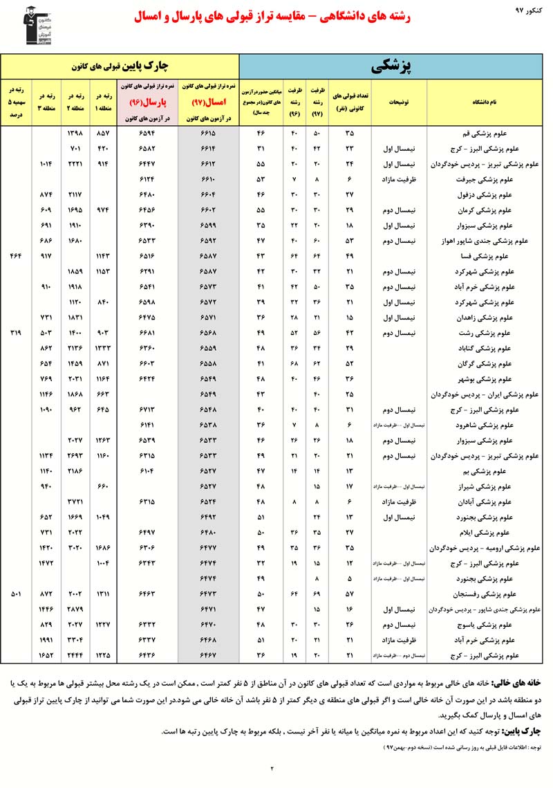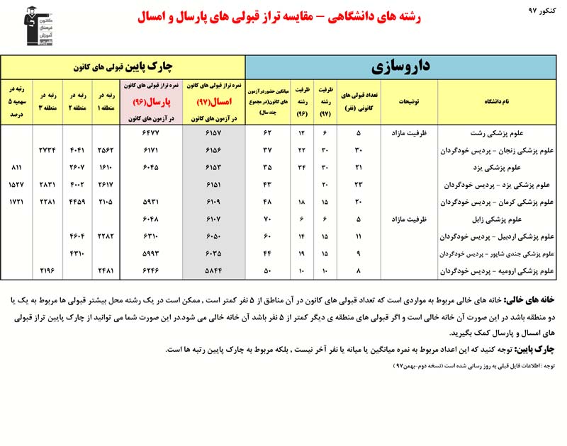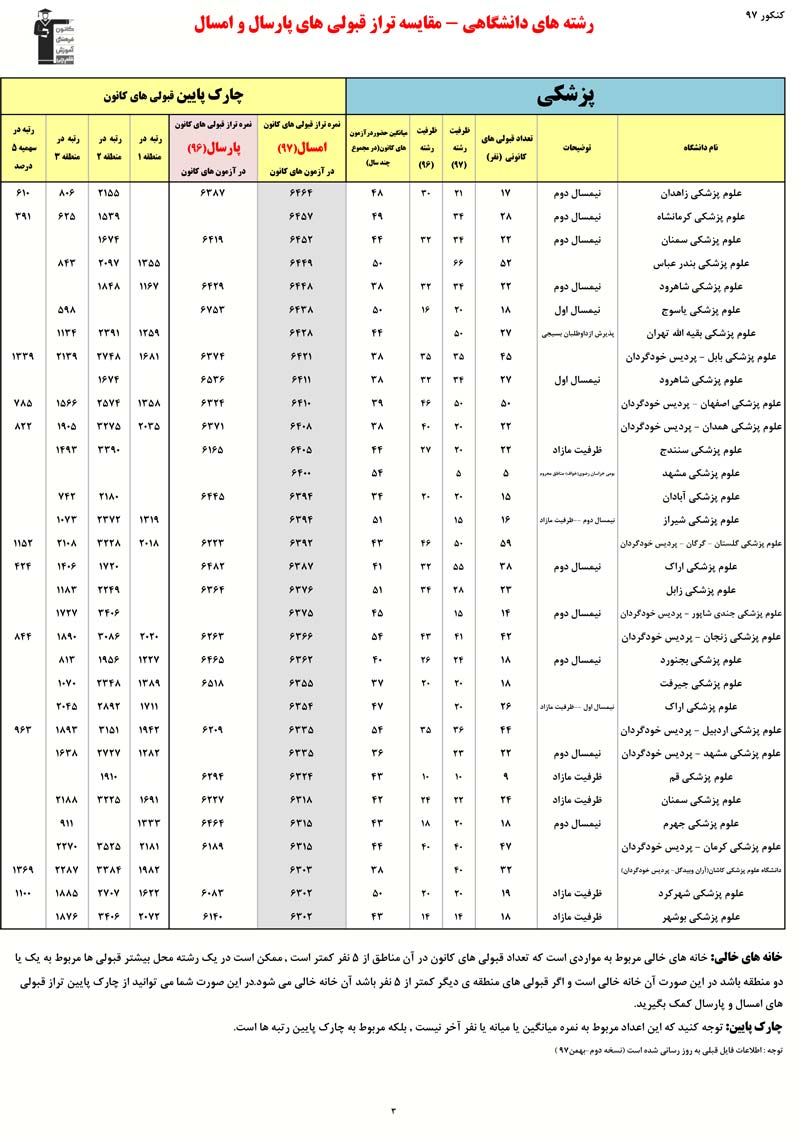 رتبه و تراز قبولی های کانونی در رشته های پزشکی - دندان پزشکی - دارو سازی را در ادامه مشاهده کنید. در این فایل تراز کانونی قبولی ها در دو کنکور 96 و 97 مقایسه شده است. اطلاعات رتبه ها مربوط به کنکور 97 است.