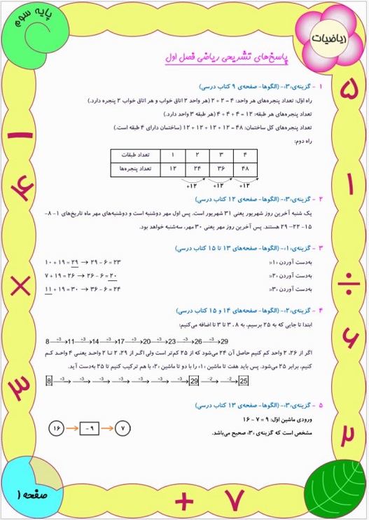 نمونه سوالات پیشرفته فصل اول ریاضی سوم دبستان به همراه پاسخ