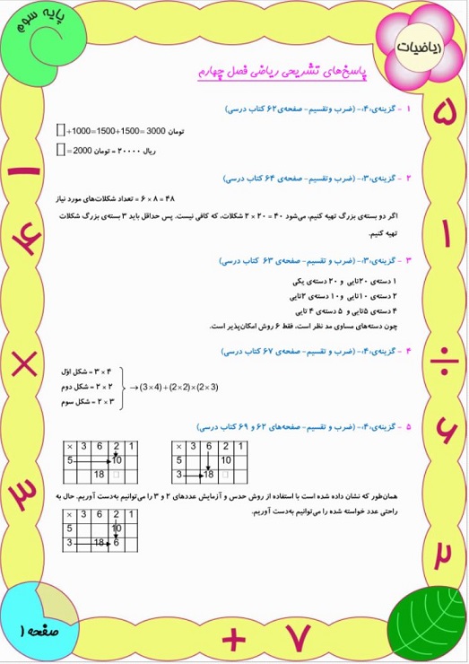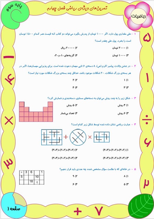 نمونه سوالات پیشرفته فصل چهارم ریاضی سوم دبستان به همراه پاسخ