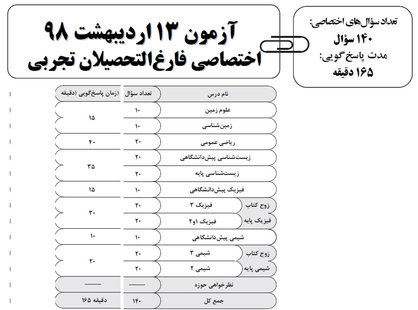 کنکوریهای عزیز رشته تجربیسلامتعداد سؤال ، زمان پاسخ گویی آزمون 13 اردیبهشت در گروه فارغ التحصیل بدین شرح است: