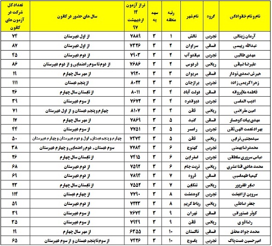 لیست رتبه های تک رقمی منطقه ی 3 که در آزمون 14 اردیبهشت 97 حاضر بوده اند: