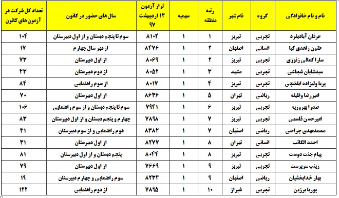 لیست رتبه های تک رقمی منطقه ی 1 که در آزمون 14 اردیبهشت 97 حاضر بوده اند: