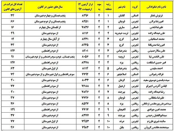 لیست رتبه های تک رقمی منطقه ی 2 که در آزمون 14 اردیبهشت 97 حاضر بوده اند: