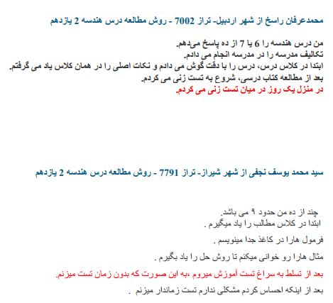 در این مطلب روش مطالعه دو دانش آموز برتر در درس هندسه قرار داده شده است.شما می توانید برای مشاهده بقیه مطالب مرتبط با درس هندسه یازدهم ریاضی بر روی لینک کلیک نمایید.
