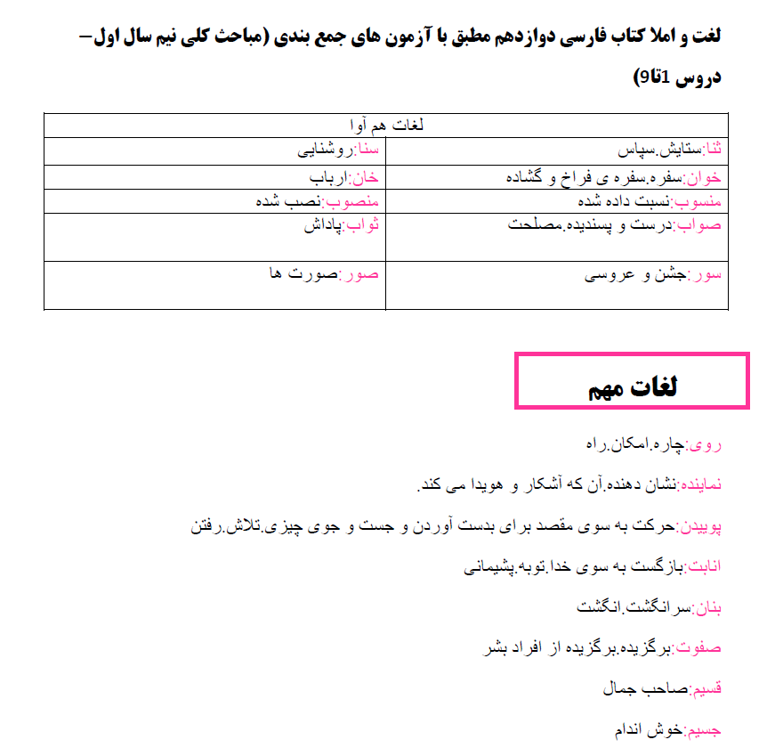 در این قسمت مباحث لغت و املا فارسی دوازدهم منطبق با آزمونهای جمع بندی (مباحث کلی نیم سال اول-دروس 1تا9) مشاهده میکنید.