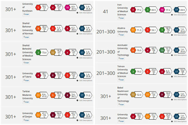 به این ترتیب برای دانشگاه علوم پزشکی ایران رتبه ۱۷ در هدف سلامت و رفاه برای مردم، برای دانشگاه کاشان رتبه ۲۰۰-۱۰۱ در هدف کیفیت آموزش، برای دانشگاه کردستان رتبه ۲۰۰-۱۰۱ در هدف برابری جنسیتی و رتبه ۳۰۰-۲۰۱ در هدف کیفیت آموزش، برای دانشگاه شهید باهنر کرمان رتبه ۳۰۱+ در هدف کیفیت آموزش، برای دانشگاه علوم پزشکی شهید بهشتی رتبه ۷۸= در هدف سلامت و رفاه برای مردم، برای دانشگاه تربیت مدرس رتبه ۲۰۰-۱۰۱ در هدف صنعت، نوآوری و زیرساخت و رتبه ۲۰۱+ در هدف اشتغال مناسب و رشد اقتصادی اعلام شده است.