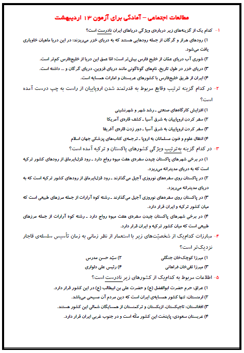 در زیر نمونه سوالهایی از درس مطالعات اجتماعی برای شما آورده شده است. سوالها را به دقت بخوانید و آن ها را پاسخ دهید سپس پاسخ خود را با پاسخ تشریحی که در مطلب بعدی برای شما میآوریم مقایسه کنید. مباحث این سوالات منطبق بر مباحث آزمون 13 اردیبهشت میباشد.