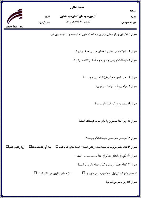 همراهان عزیز دوم دبستان در تصاویر پایین نمونه سوالات درس اول تا ششم درس هدیههای آسمان دوم دبستان را به همراه پاسخ آنها برای شما قراردادیم تا با حل این سؤالها برای آزمونهای پایان سال آماده شوید.