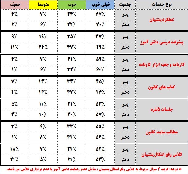 دانش آموزان دختر نسبت به پسر از آیتم های: عملکرد پشتیبان ، کتاب های کانون و جلسات 5نفره رضایت بیشتری داشته اند.