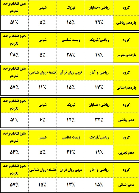 همان طور که در جدول قابل مشاهده است گرایش دانش آموزان دهم و یازدهم ریاضی ، به ترتیب به دروس ریاضی ، فیزیک و شیمی می باشد.