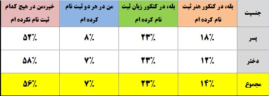 درصد متقاضیان شرکت در کنکور زبان در دختران و پسران به یک میزان است. 23 درصد از دختران و پسران در کنکور زبان نیز ثبت نام کرده اند. هم چنین 18 درصد از پسران و 12 درصد از دختران نیز در کنکور هنر ثبت نام کرده اند. حدود 8 درصد نیز متقاضی شرکت در هر دو کنکور هنر و زبان هستند.