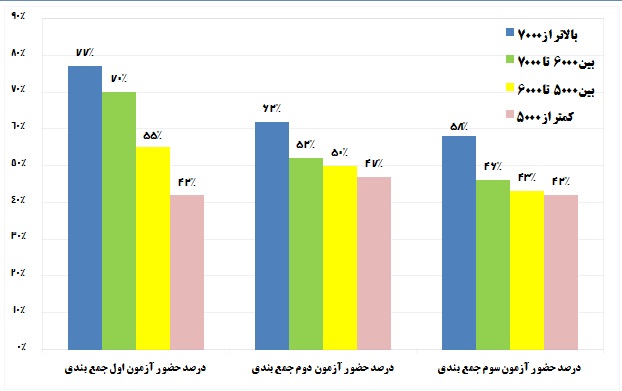 همان گونه که در جدول مشاهده می کنید ، در آزمون های جمع بندی نیز حضور دانش آموزان برتر به مراتب بیشتر از ترازهای متوسط می باشد. جالب اینکه این اختلاف درصد حضور دانش آموزان برتر با دانش آموزان متوسط ، در آزمون های دوران جمع بندی به مراتب بیشتر از آزمون های طول سال تحصیلی می باشد. در آزمون هایی که در طول سال تحصیلی برگزار می شود به طور معمول ترازهای برتر در حدود 10 تا 15 درصد ، حضور بهتری از ترازهای متوسط دارند. در حالی که در آزمون های جمع بندی این اختلاف به بیش از 30 درصد نیز رسیده است. با توجه به مشابهت قابل توجه آزمون های جمع بندی کانون با کنکور سراسری ، همین حضور بهتر ، به دانش آموزان برتر کمک می کند تا بتوانند آمادگی بیشتری جهت کنکور سراسری کسب نموده و نتیجه بهتری به دست آورند.