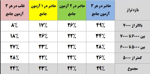 فقط 50 درصد از دانش آموزان ترازهای کمتر از 6000 در 2 یا 3 آزمون جامع حضور داشته اند. هم چنین 28 درصد از ترازهای کمتر از 5000 در هیچ کدام از 3 آزمون جامع شرکت نکرده اند.