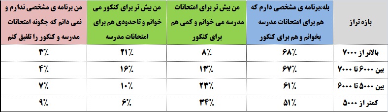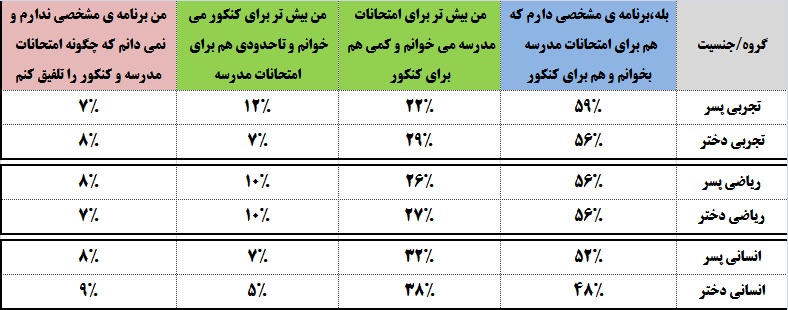 همان طور که در جدول قابل مشاهده است ، دانش آموزان تجربی ، ریاضی و انسانی به ترتیب 57 ، 56 و 50 درصد ، برنامه مشخصی برای تلفیق مطالعه برای کنکور و امتحانات مدرسه را دارند.