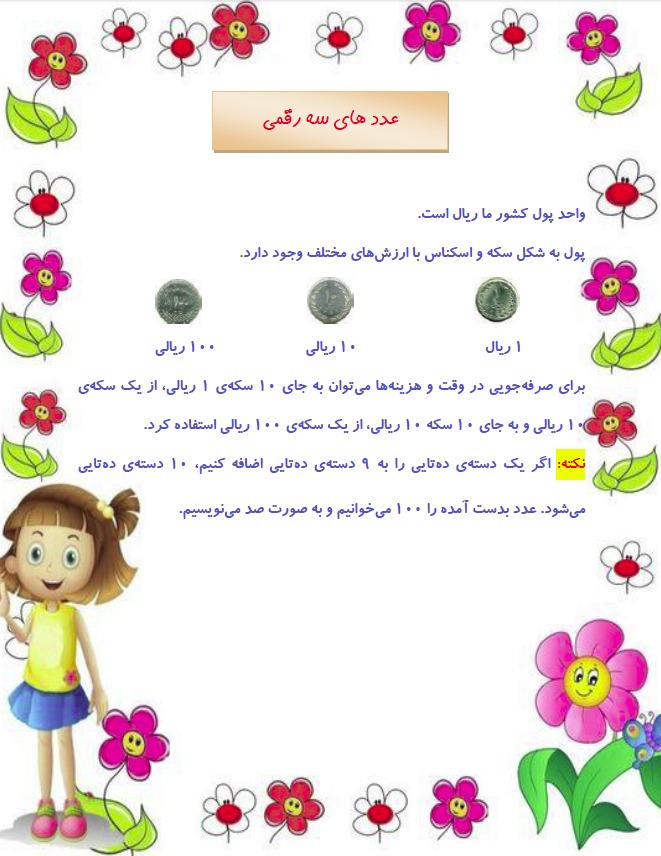 در تصاویر زیر ، درسنامه مربوط به فصل چهارم ریاضی دومدبستان ، مبحث عددهای سهرقمی، توضیح داده شدهاست.شما میتوانید هرگونه سوال یا مشکلی درباره این متن یا به طورکل درباره این فصل داشتید در کامنتها بپرسید تا سریع پاسخ دادهشود. جهت مطالعه سایر مطالب مرتبط با درس ریاضی دوم دبستان میتوانید از طریق لینک زیر اقدام فرمایید.ریاضی دوم دبستان