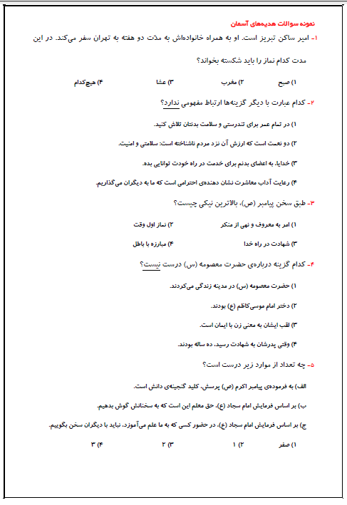 در زیر نمونه سوالهایی از درس هدیههای آسمان برای شما آورده شده است. سوالها را به دقت بخوانید و آن ها را پاسخ دهید سپس پاسخ خود را با پاسخ تشریحی که در مطلب بعدی برای شما میآوریم مقایسه کنید. مباحث این سوالات از مطالب نیمسال دوم کتاب درسی است.