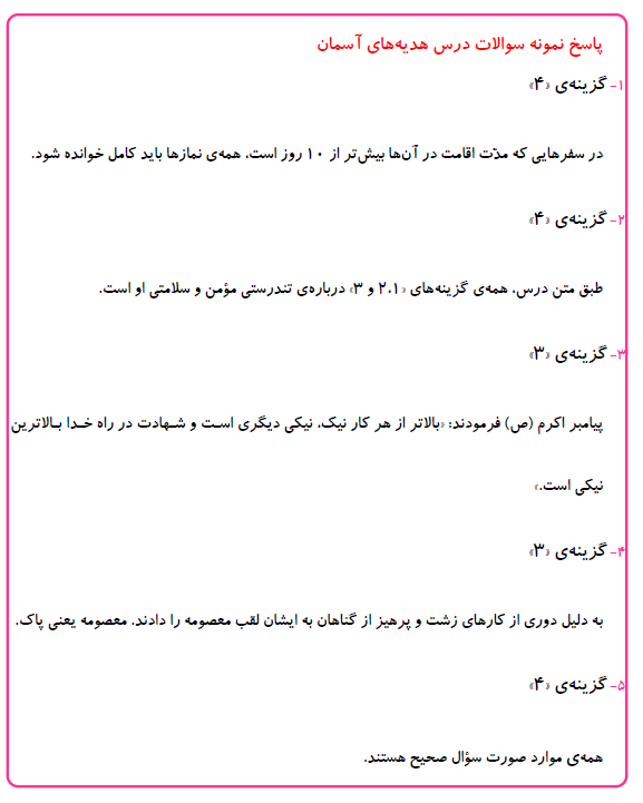 در زیر پاسخ نمونه سوالات هدیههای آسمان که در مطلب قبل برای شما قرار دادیم، آورده شده است. سوالها را به دقت بخوانید و آنها را پاسخ دهید سپس پاسخ خود را با پاسخ تشریحی که در زیر برای شما آوردهایم مقایسه کنید.