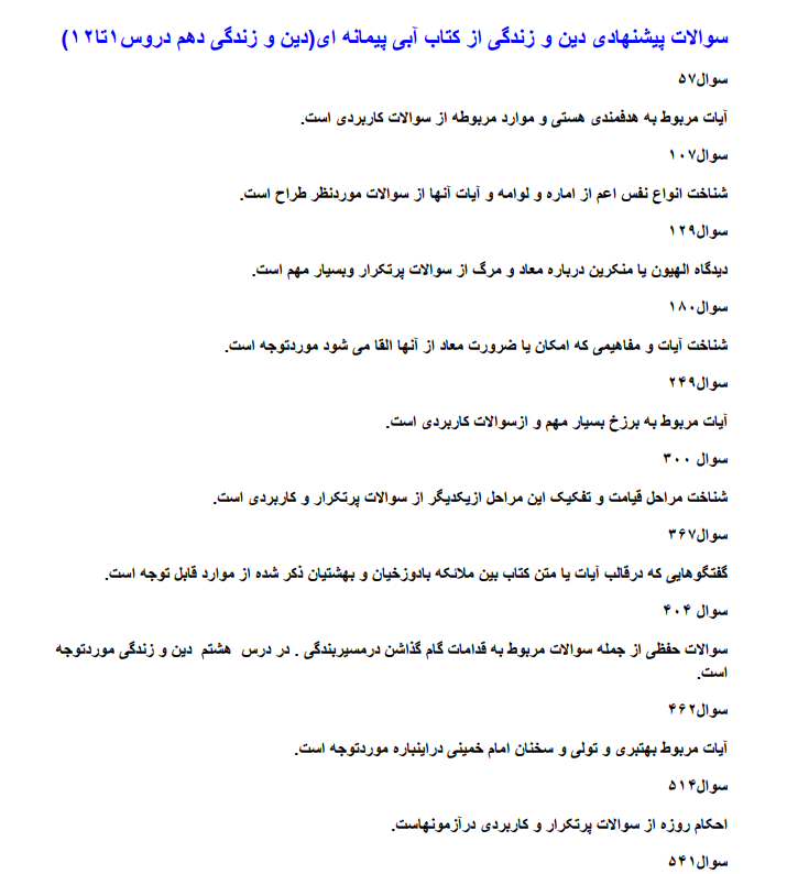 سوالات پیشنهادی دین و زندگی دهم منطبق باآزمونهای جمع بندی