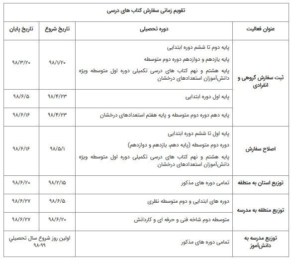 بر این اساس ثبت سفارش گروهی و انفرادی کتب برای پایه دوم تا ششم ابتدایی، پایه یازدهم و دوازدهم دوره دوم متوسطه، پایه هشتم و نهم کتابهای درسی تکمیلی دوره اول متوسطه ویژه دانش آموزان استعدادهای درخشان از ۲۰ فروردین شروع شده و تا ۲۰ خرداد ادامه دارد.