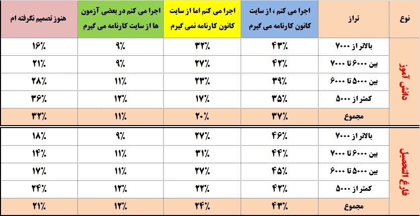 همان طور که در جدول بالا مشاهده می کنید ، 79 درصد از فارغ التحصیلان و 68 درصد از دانش آموزان اعلام کرده اند که روش سه روز یکبار را اجرا خواهند کرد. هم چنین دو سوم نفراتی که اعلام کرده اند روش سه روز یکبار را انجام می دهند در همه یا بعضی از آزمون ها نیز از سایت کانون کارنامه دریافت می کنند.