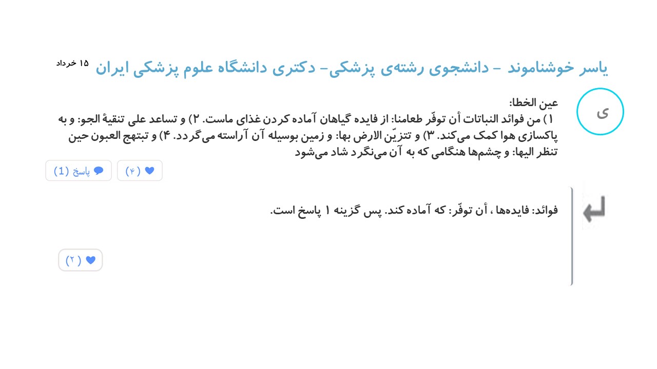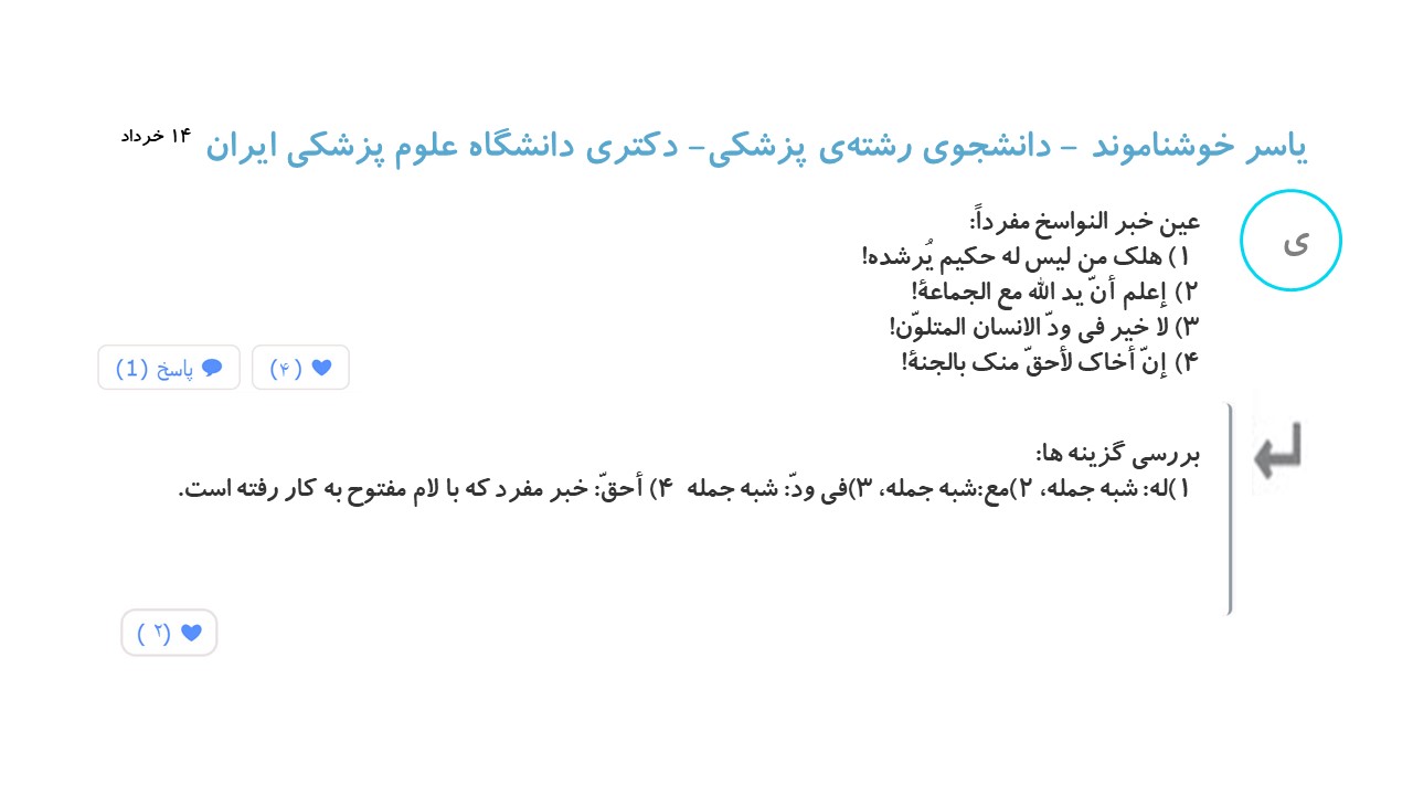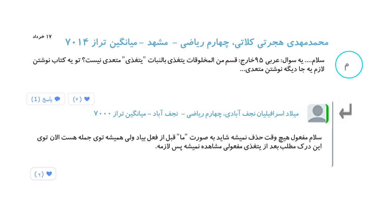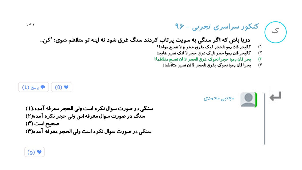 در ادامه بررسی کامنتهای علمی شما در سایت کانون ، چند پرسش مربوط به درس عربی که توسط رتبههای برتر پاسخ داده شده اند را برایتان آماده کرده ایم .